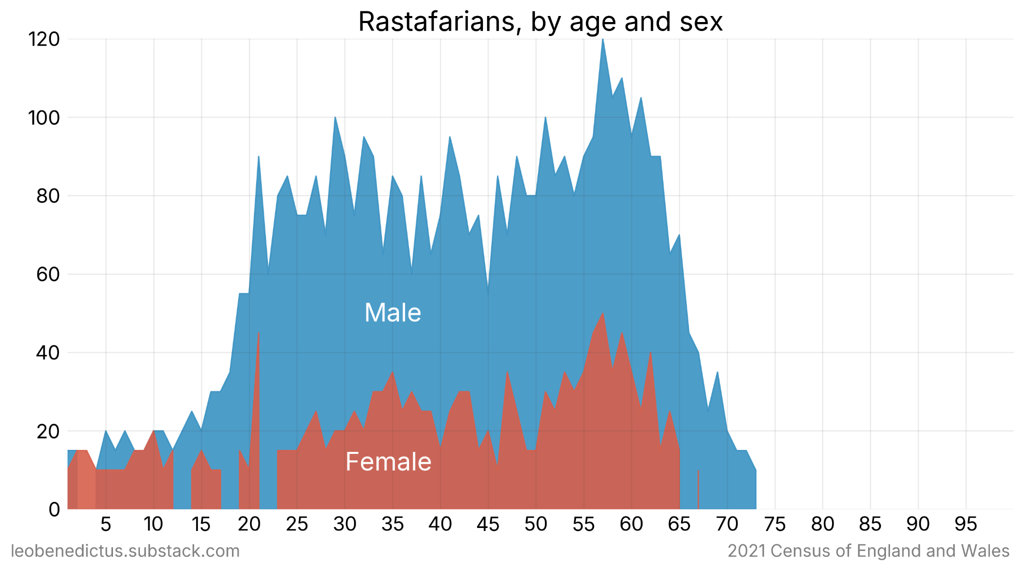 By contrast, you’d say that Rastafarianism is a very small religion in the UK, and neither dying out nor catching on—perhaps in part because of the strong male skew among its followers.