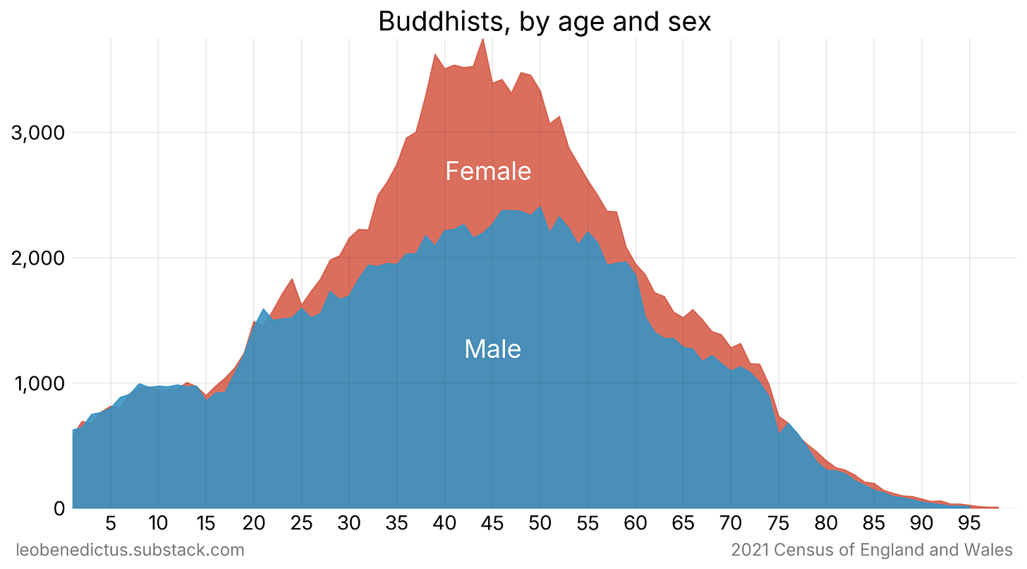 Buddhism is a different story. The number of people saying they are Buddhists lines up pretty closely all the way through life—except in middle age, where women have a large lead.