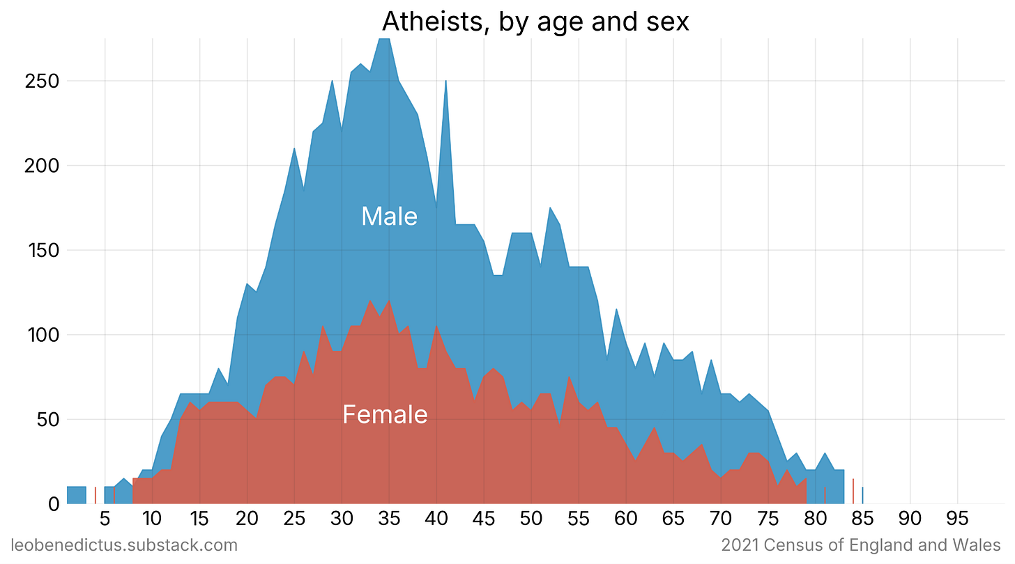As a result, I suspect this data might also underestimate the real numbers. It makes sense to guess that a lot of Atheists in particular may have been satisfied with “No Religion”, and not gone to the extra trouble of giving their non-belief a name. Those who did go to the extra trouble were much more likely to be men, of course.